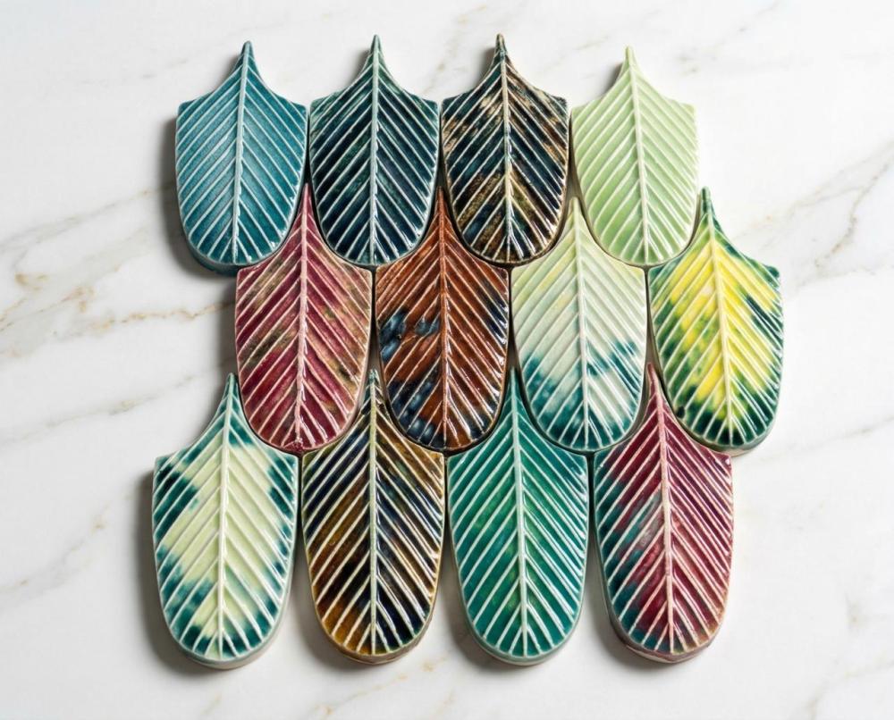 Для санузла нашей клиентки Ольги из Москвы мы создали плитку «Фикус» с фактурой, но в необычной, живой цветовой гамме.