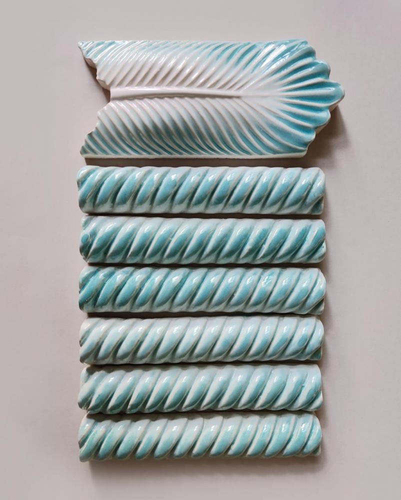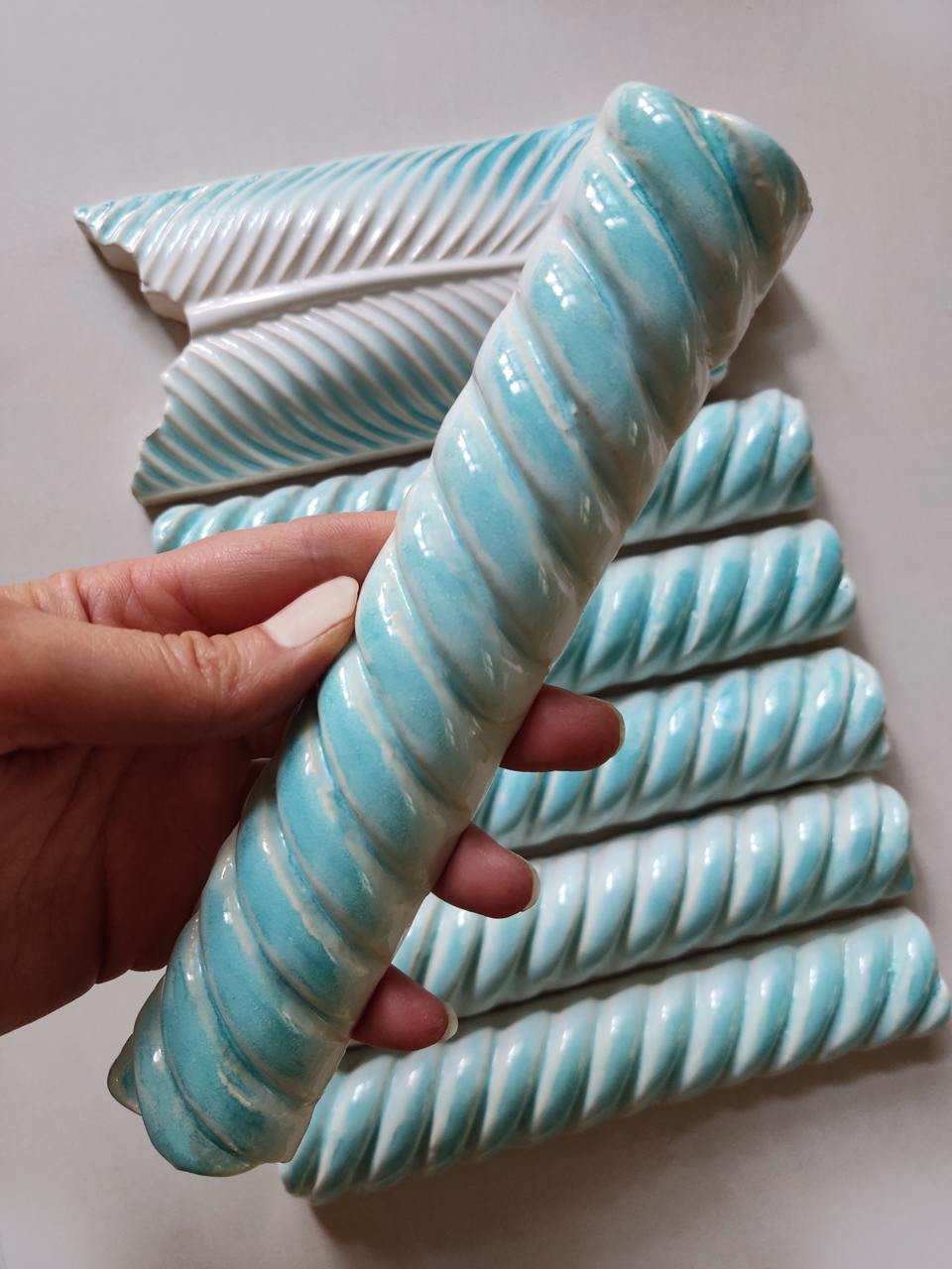 Каждый проект — это яркая история, где плитка ручной работы становится частью идеи. Дизайнер Анатолий, давний друг нашей мастерской, снова доверил нам реализацию своей задумки. В этот раз он заказал коллекцию «Перья» в необычном бело-голубом омбре для клиента из Сочи.